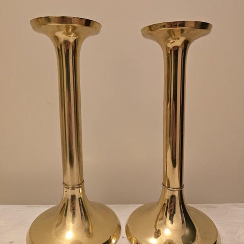 Silverfärgade ljusstakar i metall. Klassisk, hög modell med fyrkantig fot och rund ljushållare upptill. Passar för placering på golv eller större ytor som exempelvis sidobord eller byrå. Säljes som par enligt bild. Höjd 52cm