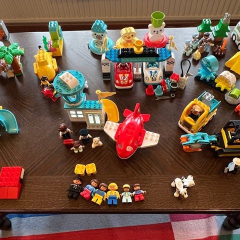 Nästan helt komplett. Det enda som saknas är 1st grönklädd gubbe. Utbytt mot liknande gubbe (gröna byxor, röd ’Octantröja’ samt röd keps)
