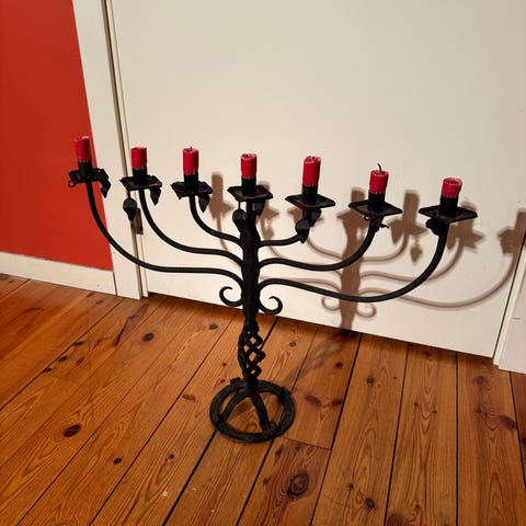 En golvljusstake i smide, plats för 5 ljus. Fint använt skick. Ca en meter hög.