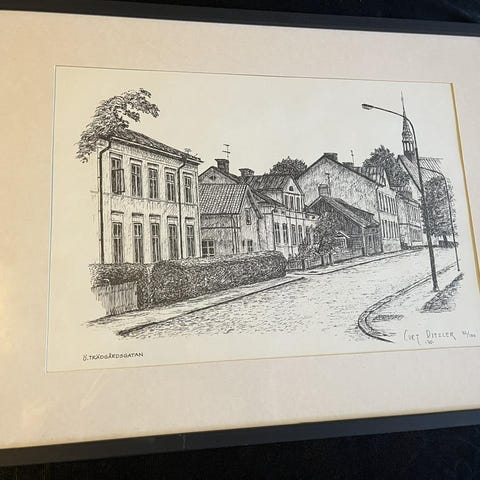 Litografi av Lennart Jirlow, 117/390, togs fram i samband med jubileumsmiddag vid Sofieros Slottsrestaurang år 2006 (den riktiga menyn finns bifogad på baksidan). Professionellt inramad på ramverkstad med rammått 34 x 44 cm, kommer med dubbel passepartout. Signerad och numrerad.