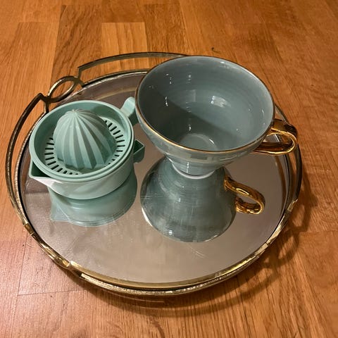 spegel, aromdiffusor, tallrikar växter, fotoramar