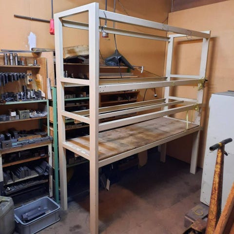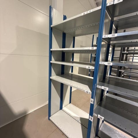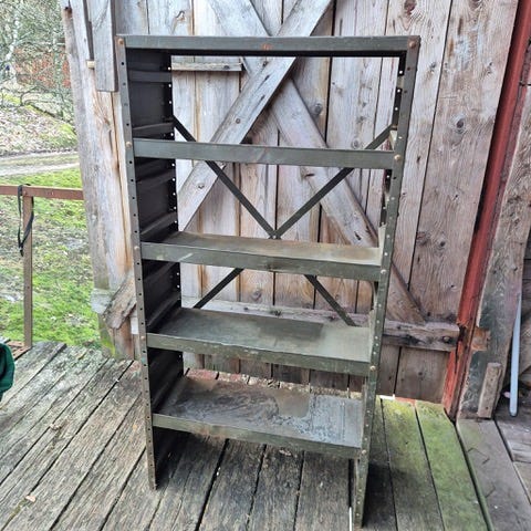 Säljer 12 riktigt rejäl och stabil förvaringshylla i metall med massor av fack – perfekt för dig som vill få ordning på skruvar, muttrar, eldelar eller annat småplock i verkstan.