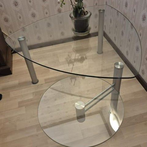 Glas soffbord med en unik bas i form av en antik amphora. Kombinationen av glas, metall och keramik ger ett elegant inslag i vardagsrummet. Glaset har några mindre repor, men det övergripande skicket är bra. Bordet är tungt och stabilt.