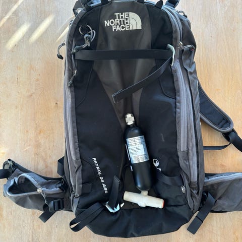 North Face 24 Patrol lavinryggsäck. Hade den under min säsong förra året. Får plats med allt man vill ha med för dagen. Går att spänna på snowbord/skidor och isyxa på utsidan. Finns ett litet hål(syns på sista bilden) där man packar ner lavinutrustningen blir så på alla ryggsäckar efter ett tag. Hålet syns inte sen när man packat ner lavinutrustningen. Patronens bäst före datum gick ut förra året, har fått den inspekterad och vägd på udens sport. Den bör alltså fungera som den ska. Vill man vara extra säker kan man köpa ny patron eller prov spränga och fylla på hos en återförsäljare kostar några hundralappar.