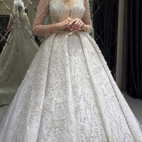Klänningen är helt täckt med vackra broderier och pärlor, och i verkligheten är den ännu finare än bilden