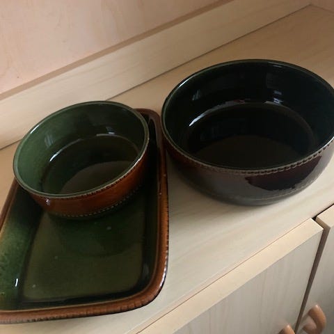 Skål/fat från Gefle Bo Fajans ca 20 i dia och ca 5 hög. Det finns två små nagg på undersidan se bilder. Kan mötas utmed gröna linjen från Abrahamsberg till medborgarplatsen