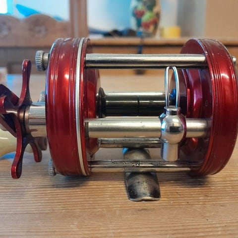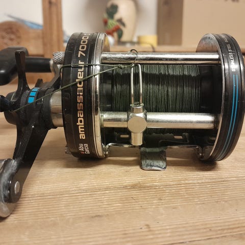 En klassisk laxfiskerulle. Rullen har en del mindre märken efter användning men den är väl omhändertagen och servad och fungerar som den ska. Bromsen är jämn och fin och knarrfunktion finns. Rullfotsnummer är 850500.