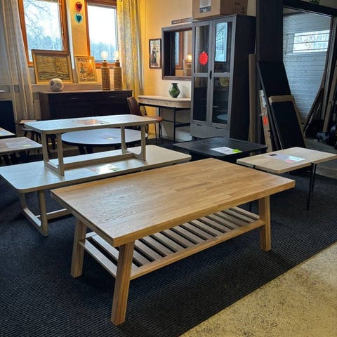 Soffbord Louise i ek, har nyligen utgått i sortiment hos Mio. Stilren design med tre ben. Praktisk hylla för förvaring under. 90x90x48 cm.