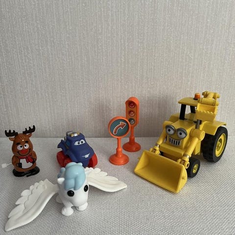 * Blandade retro leksaker att hänga på barnvagnen eller på annat lämpligt ställe för barnet att ligga och titta på.
