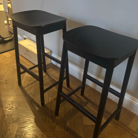 A pair of IKEA Lillånäs bar stools in a burnished orange vegan leather cover. One of the stools have a small mark at the bottom (pic 4) but in good condition otherwise