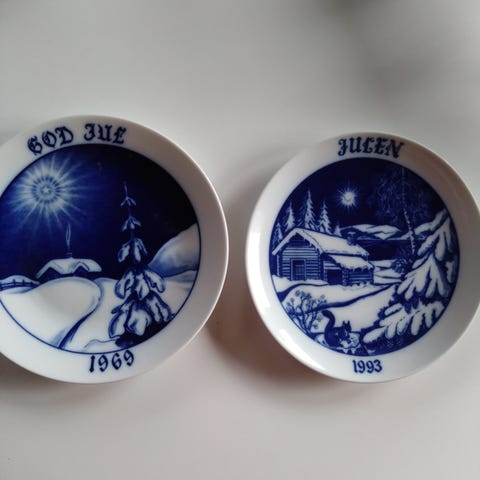 Fyra stycken samlar tallrikar från 1975-1978. Tillverkade av Tove Svendsen i Danmark. Fåglarna är talgoxe, bofink, domherre och rödhake. Tallrikarnas diameter är ca 19,5 cm. Finns i Viby i Sollentuna, kan alternativt medtas till Sigtuna.