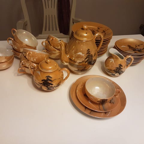 Äldre orientalisk kaffeservis i japansk Kutani-stil. Tunt porslin med målade traditionella motiv i fina färger. Japanska landskap och människor.