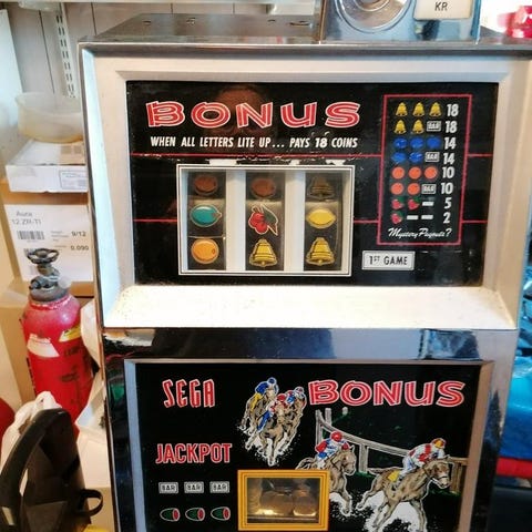 Bally emarmad bandit, Quick Draw, klassisk bandit gjord för enkronor. Ibland vill den inte mata ut vinsten, annars fungerar allt. Nyckel finns till låset, och ca 300 enkronor. Kan provspelas.