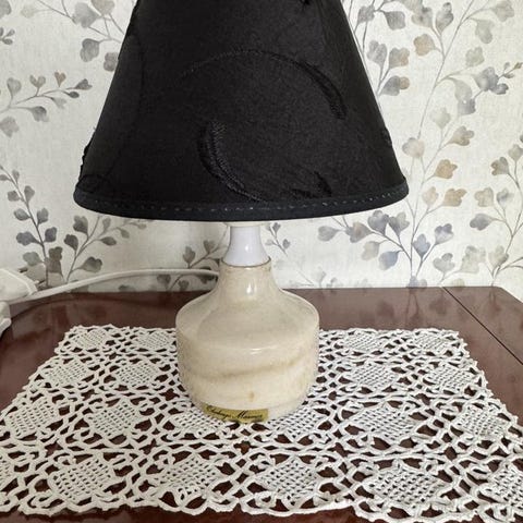 Mycket fin bordslampa i svensk ljus Ekebergsmarmor. Lamphållare E14. Glödlampa och skärm ingår. Diameter fot ca 7,5 cm Höjd ca 20 cm med glödlampa. Diameter beige skärm ca 14 cm. Höjd ca 10 cm. (5)