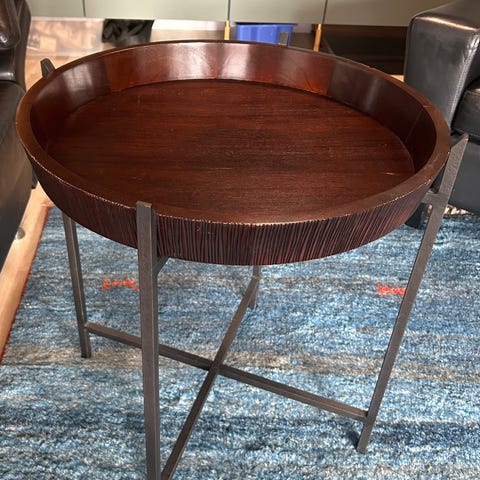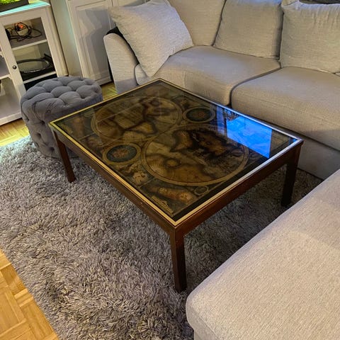 Soffbord med schackbräde, roulettehjul och spelplan för kortspel. Perfekt för spelkvällen.
