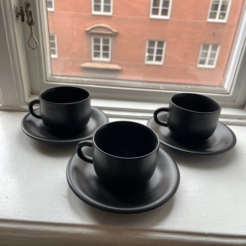 Grå espressokoppar med fat i porslin från italienska Society Limonta. Höjd 5 cm och 5 cim i diameter. I nyskick. Nypris ca 4000kr