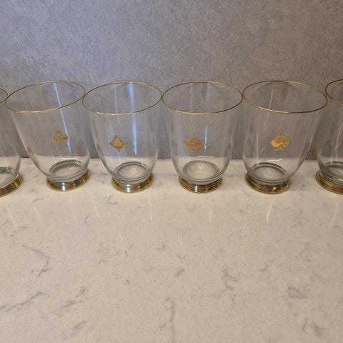 Fyra glas från 40-talet. Svart fot med röd kant och spelkort. Alla fyra glasen är hela!