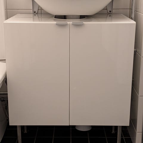 Säljer ett praktiskt badrumsskåp anpassat för handfat – med utskärning upptill för rör.
