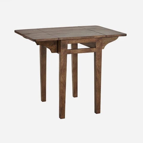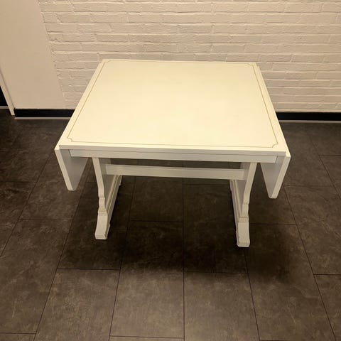 Äldre klaffbord med några fläckar och småskador. Ena sidan av träpluggarna som håller upp klaffen är trasig, men går enkelt att fixa.