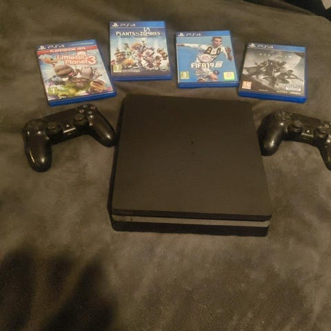 PS4 med 2 handkontroller, stick-controllers och 11 spel