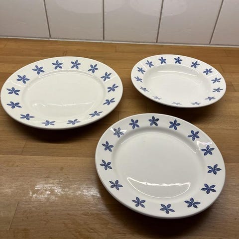 Ljusblå tallrikar från IKEA. Sex stycken mattallrikar och sex stycken assietter. Diameter 26cm och 20cm, se bilder. Bra skick, förutom en mattallrik som har ett mindre märke , se bild.