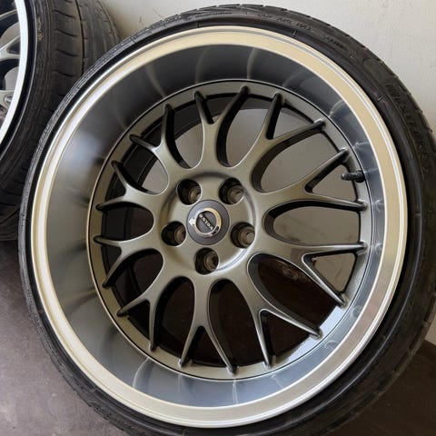 Begagnade Rondell fälgar med däck. Fälgbanorna är polerade.