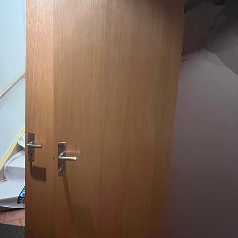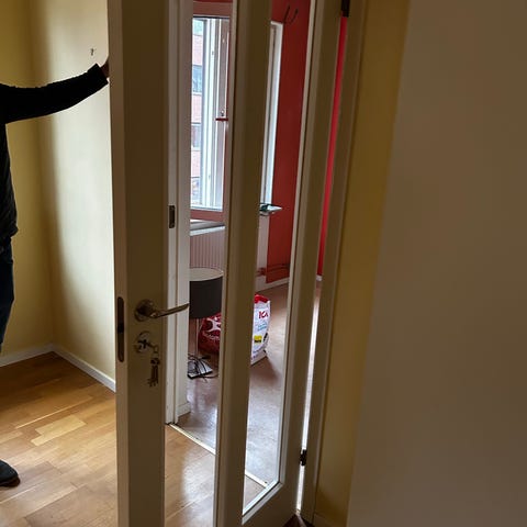 Helt nytt och mycket vackert innerdörrpar i ekfanér med glaspartier, inklusive karm, dörrfoder och tröskel – i mycket gott skick. Har varit monterat men aldrig använt.