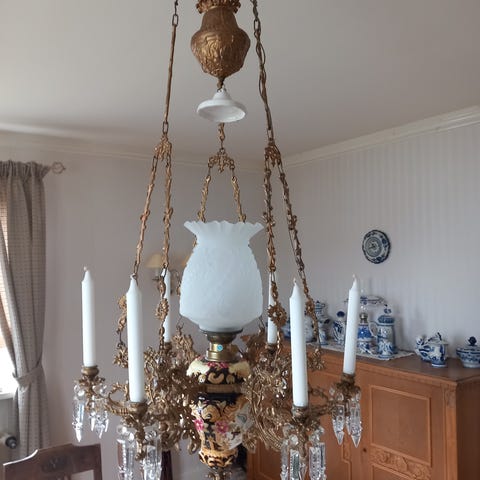 Antik Majolika-lampa med sex ljusarmar utrustade med kristalldetaljer och en mittdel i porslin med dekorativa målade blommor. Lampan är upphängd med kedjor och har en kombination av metall och porslin i sin konstruktion. Den fungerar med el, ljus och fotogen. Ljushållarna går att ta bort.
