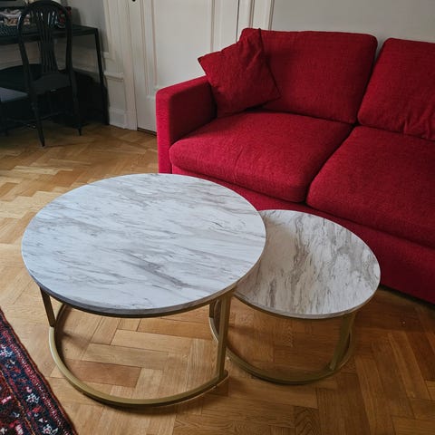 Fina, stabila satsbord, ett set med två bord i tidlös skandinavisk design från Yumi. Bordsskivorna består av svartlackad askfaner. Stora bordet; Ø 50 cm, höjd 45 cm, lilla bordet; Ø 40 cm, höjd 40 cm. Båda borden är i fint skick och knappt använda de då stått i ett gästrum.