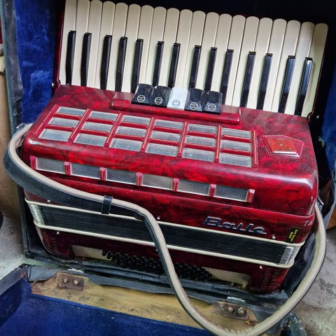 Detta dragspel tror jag är från 60- 70- talet. Det heter Joles Maruett och har för mig det är ett 2 körigt dragspel. Det finns en väska som tillhör och medföljer.