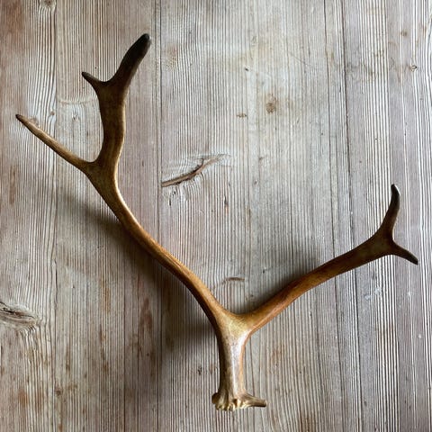 Horn trofé som väggdekoration i benfärgad ton. Består av komplett hornkrans med skalle, lämplig som inredningsdetalj eller jaktdekoration. Kan monteras på vägg eller placeras som prydnad enligt önskemål.