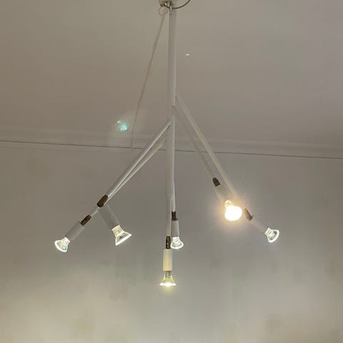 Säljer en stilren taklampa i blank krom med fem ljuskällor. Lampan har ett modernt och minimalistiskt uttryck som passar perfekt över matbordet, i vardagsrummet eller hallen.