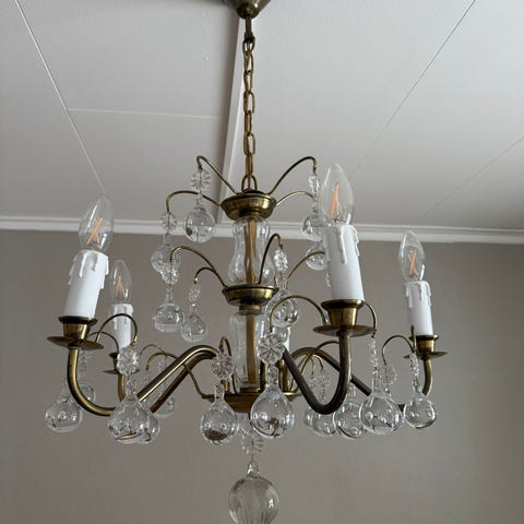 Kristallkrona/takkrona med sex armar i mässing och glasdetaljer.