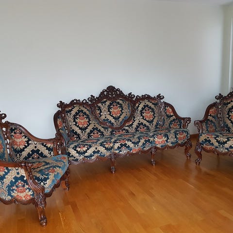 Säljer nu våra vardagsrums möbler i barock stil: 2st 3-sits soffor, soffbord, sidobord, matbord med 6 st stolar.