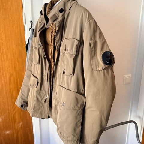 Jacka. Grönberg färg i militärinspirerade tyg. Ej fordrad. Knapp knäppt. Långarmad i storlek M. Ej använd som ny. Text men sitter lite dåligt tycker jag.