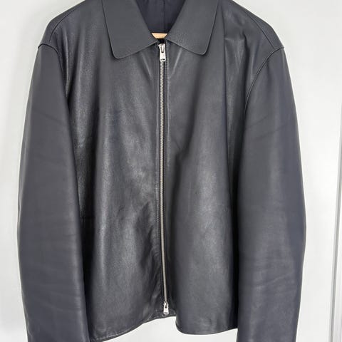 Säljer en svart skinnjacka med rak passform, dragkedja framtill och två fickor med dragkedja. Lite cropped modell.