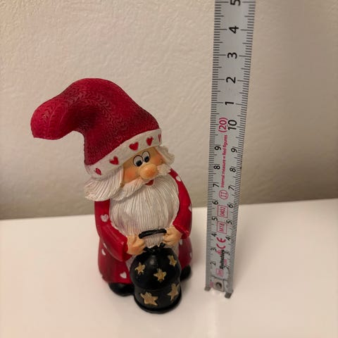 finns en hel & välvårdad målad jultomte stående på träfot, för julskyltning odyl. 1 meter hög, på fot ett par dec till.