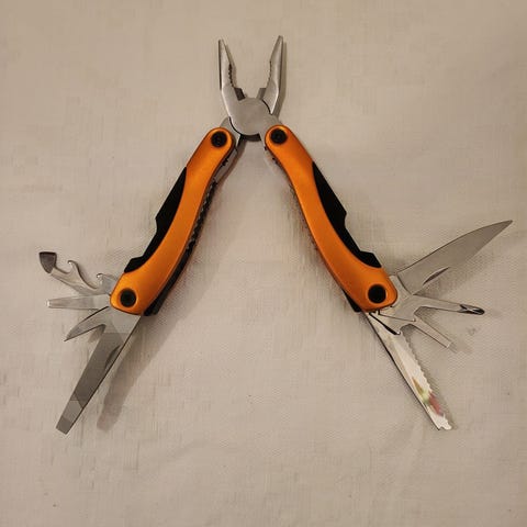12 användbara funktioner, bland annat tång, kniv, flasköppnare, såg och skruvmejsel. Kommer med en förvaringsväska i polyester med en hälla så den går att fästa i skärp eller liknande.