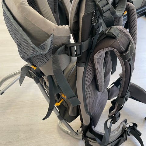 Osprey Poco AG barnbärstol i svart och grått. Bärstolen har justerbart bärsystem med vadderade axelremmar och höftbälte samt ventilerad ryggpanel. Sitsen för barnet är vadderad med justerbart huvudstöd och säkerhetssele. Modellen har inbyggd ram som ger stabilitet vid i- och urstigning samt flera fack och fickor för packning. Passar för att bära barn vid promenader och vandring.