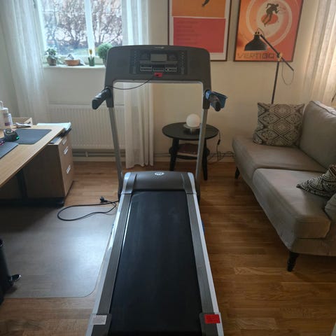 Jag har gått ner i vikt med hjälp av detta löpband och nu är det dags att hitta en ny ägare. Det är tungt och rejält, behövs 2 personer och ett släp för att transportera den. Ca 90 cm bred och 190 cm lång.