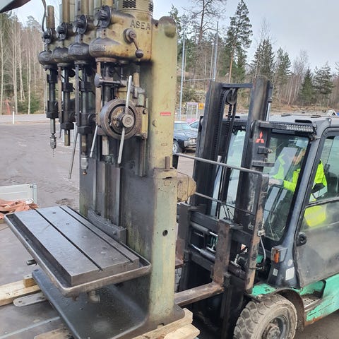 Gammal pelarborr, antik. Ursprungligen byggd för central remdrift men kan utrustas för eldrift. Tre hastigheter med remskiva. MK 2 i spindeln för chuck och borr. Inga remmar finns.