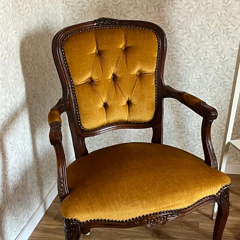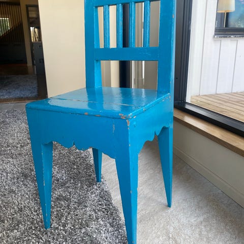 Vit antik vintage stol. Höjd: 91,5cm, Längd: 49cm, Bredd: 42cm. Finns i Frändefors.