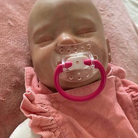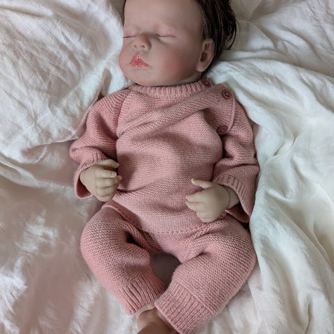 Söt reborn docka med tillbehör. Dockan har en stickad tröja och matchande byxor med tyllkjol, samt stickade tossor. En haklapp och napp medföljer också. Vinyl Body: (girl).)