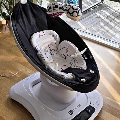 Elektrisk babysitter från 4moms, fint skick men finns lite skavanker så som en liten tråd i tyget som sticker ut (se bild) sedan har en liten plastdel gått av där bågen går ut men är inget som påverkar funktionen utan är bara att bågen med bollarna på kan vridas enklare och sitter inte lika hårt.