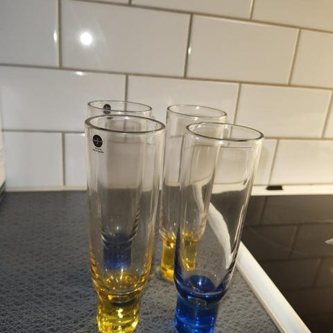 Oanvända stora vinglas från Sagaform med rocking-fot, transparenta glas med grön fot.