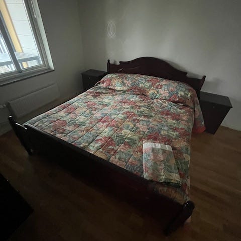 Det är en sängkam till 90 cm säng med förvaring. Det är flitigt använd men även sparsamt inga stora skadar bara några enstaka fläckar, som säkert går bort.