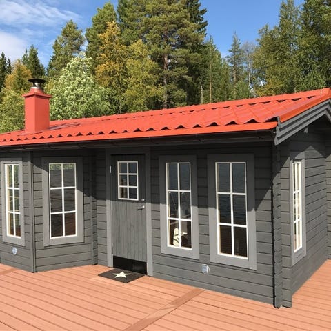 Bastun levereras helt färdigmonterad med vedkamin och skorsten installerade.