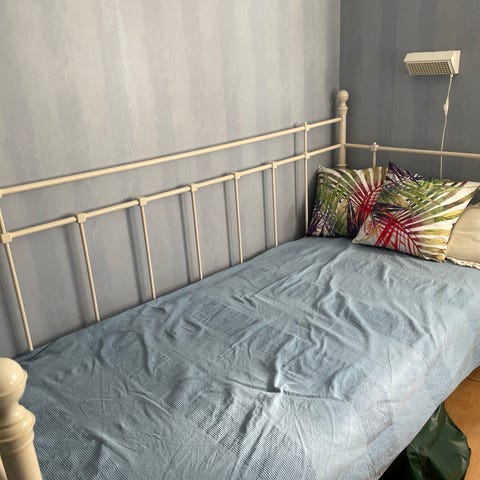 En vit sängram i metall, resår madrass DUX 1001 ( en sådan ny kostar 15000 kr) och bäddmadrass tjock 5cm En säng av superbra kvalitet