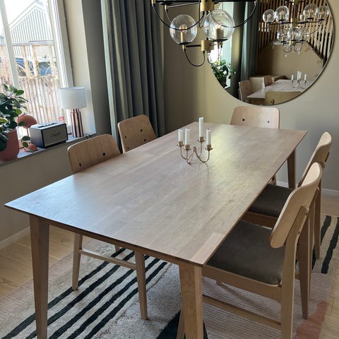 Ikea möckelby matbord säljes i bra skick. Nypris ca 9000kr. Se print screen från Ikea för exakta mått. Säljes pga lite för stort för vår nuvarande bostad. Bärhjälp ut till tex släp ingår!