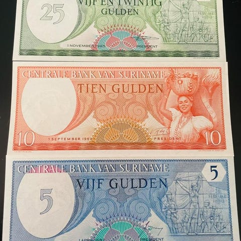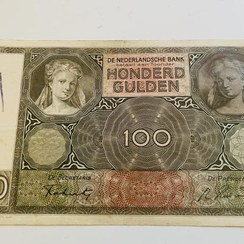 Två nederländska sedlar. Den ena är en 10 Gulden sedel. Den andra är också en 10 Gulden sedel.
